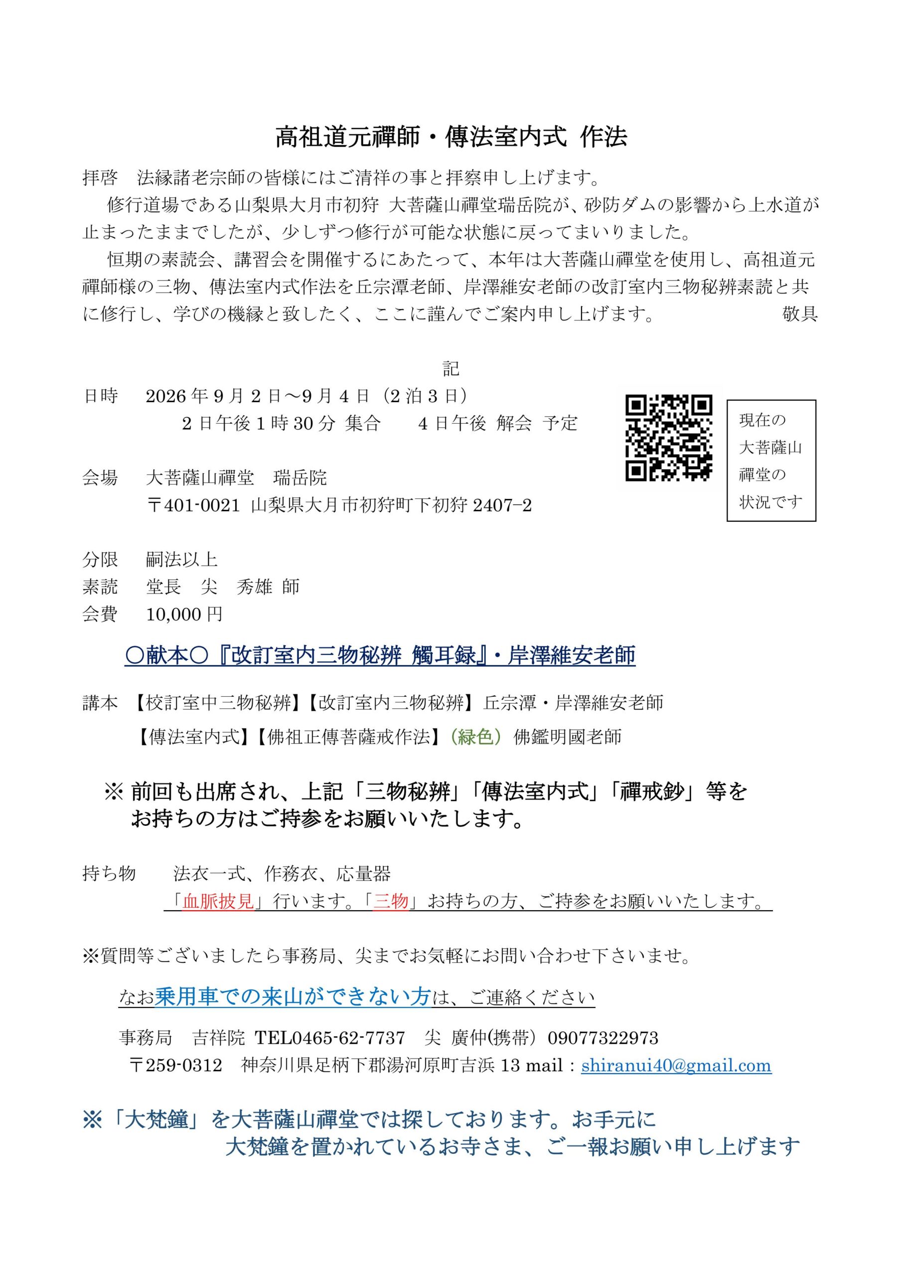 こちらのページにてご案内させて下さい。山梨県大月市初狩町にある瑞岳院にて、傳法室内式作法を修行いたします。こちらは「僧侶」の方々へのご案内となります